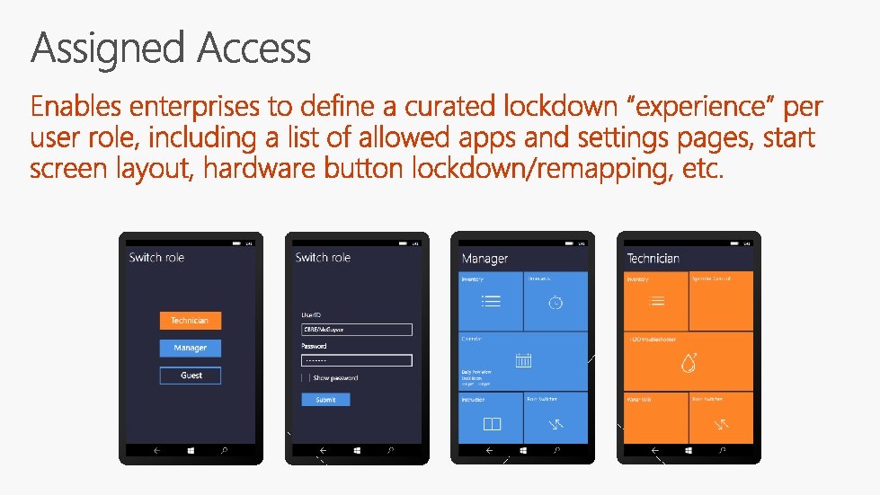 Personal devices Corporate devices Special purpose devices Owned by the employee (BYOD) Owned by the organization Personal account controls the device Work account controls the device Multiple users may use the device Highly personalized, with apps Personalization can be restricted Focus is line-of-business (LOB) Used for business, with restrictions Business apps and productivity are the main focus Personal use is not allowed IT Concerns: Malware, data separation and protection IT Concerns: Security, device configuration and compliance, app management IT Concerns: Device lockdown and reliability, app management