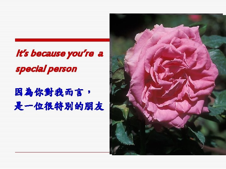 One rose for friendship A second one for Slides: 18 Download presentation One rose for friendship 第一朵玫瑰 為友情而開 A second one for love Red rose: Deepest love and respect. 第二朵紅玫瑰: 深深的愛和尊敬 One for financial wealth 第三朵 祝福你財源滾滾而來 And the last one for a long and healthy life! 最後一朵 祝你有 健康美好 長久的人生 You should not keep this message to yourself alone… Send it on … 請勿將這些祝福 留在你的信箱中 將它傳出去… That it alway feels nice to be send flowers so … 送花兒給人的感覺很棒 所以… Send these flowers to all persons you care about… 將這些花 送給你關心的那些人們吧! 别求回報, 因為”施比受更 為有福. ”(聖經: 使徒行傳 20章 35節) NO any repayment people want, because “It is more blessed to give than to receive. ” ( from Holy Bible ) Thanks !