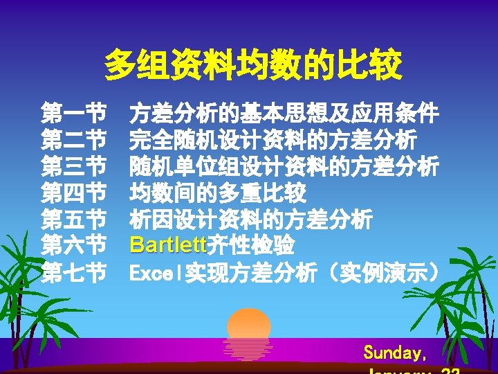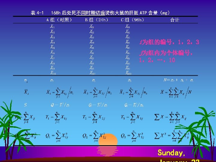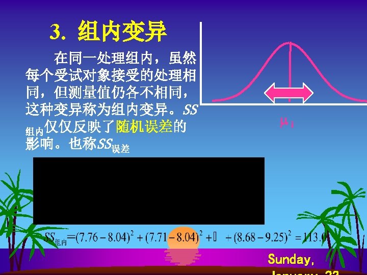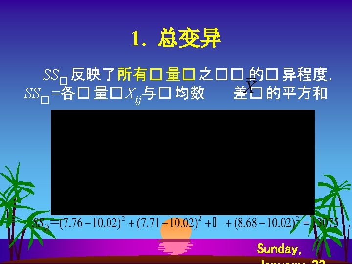 One-Factor ANOVA Partitions of Total Variation SST Variation Due to Treatment SSB s Commonly referred to as: o Sum of Squares Among, or o Sum of Squares Between, or o Sum of Squares Model, or o Among Groups Variation = + Variation Due to Random Sampling SSW s Commonly referred to as: o Sum of Squares Within, or o Sum of Squares Error, or o Within Groups Variation Sunday,