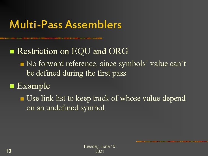 Multi-Pass Assemblers n Restriction on EQU and ORG n n Example n 19 No forward reference, since symbols’ value can’t be defined during the first pass Use link list to keep track of whose value depend on an undefined symbol Tuesday, June 15, 2021
