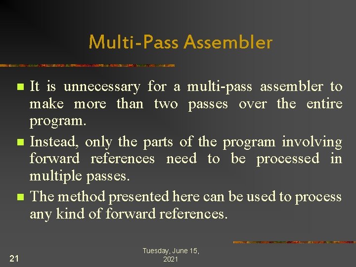Multi-Pass Assembler n n n 21 It is unnecessary for a multi-pass assembler to make more than two passes over the entire program. Instead, only the parts of the program involving forward references need to be processed in multiple passes. The method presented here can be used to process any kind of forward references. Tuesday, June 15, 2021