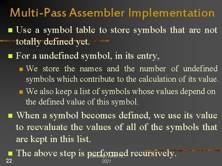 One and Multi-Pass Assembler n n So far, we have presented the design and implementation of a two-pass assembler. Here, we will present the design and implementation of n One-pass assembler n n Multi-pass assembler n 2 If avoiding a second pass over the source program is necessary or desirable. Allow forward references during symbol definition. Tuesday, June 15, 2021