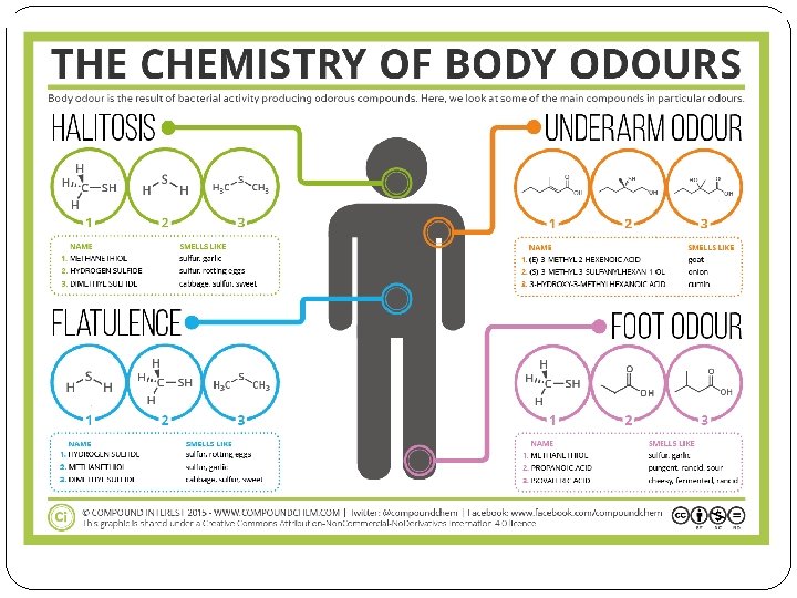 Sulfur aromas in nature are often warning signs �Stagnant water �Sewage �Poisonous gases �Skunks Ethanol versus ethyl mercaptan: substituting Oxygen with Sulfur makes a compound that is added to natural gas to make it easier to detect