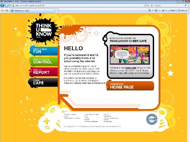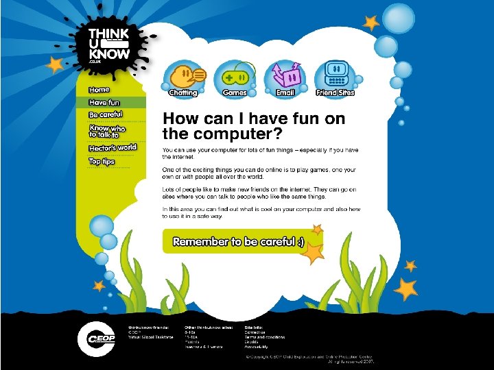 Internet Safety Weblinks Kidsmart • www. kidsmart. org. uk Childnet • www. childnet-int. org Child Exploitation and Online Protection Centre Think U Know CBBC • www. ceop. gov. uk • www. thinkuknow. co. uk • http: //www. bbc. co. uk/cbbc/help/web/staysafe