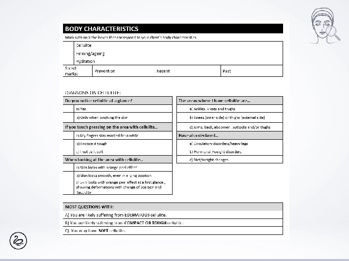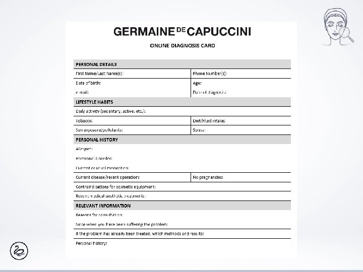 PERSONAL HISTORY • • • Allergies Hormonal disorders Current medication / recent operations Number of pregnancies Contraindications for cosmetic equipment Recent medical-aesthetic treatments