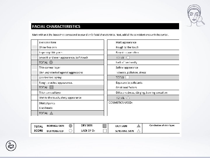 VISUAL EXAMINATION • Observe the skin’s general appearance • Check if the skin is even • Check the skin’s tone, shiny areas, size of pores, presence of redness and/or imperfections, etc. • We must observe if the following shows up during the visual evaluation: Inflammation Dull or sallow skin Hyperpigmentation Dilated pores Bags under the eyes or dark circles – Dynamic/static wrinkles – – –