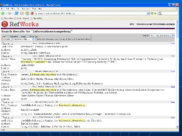 Wie werden die Einträge eingetragen? n durch Importierung von einer ganzen Reihe von Datenbanken, sowohl OPACs als auch Zeitschriftendatenbanken… - Beispiel: GBV