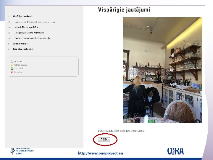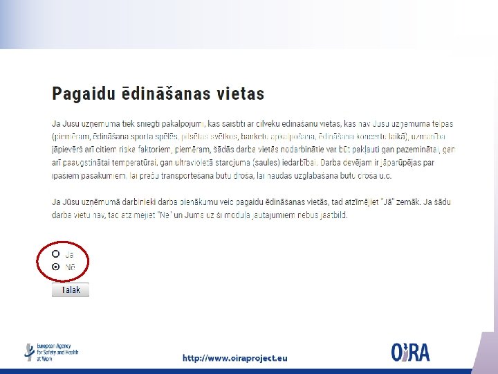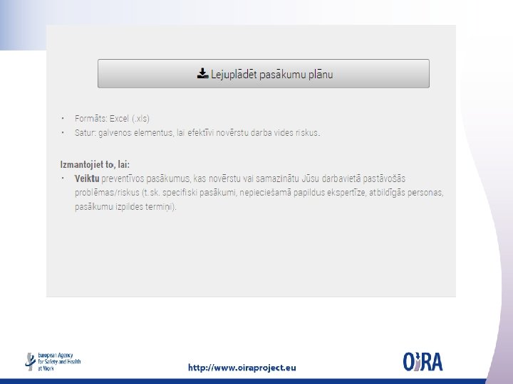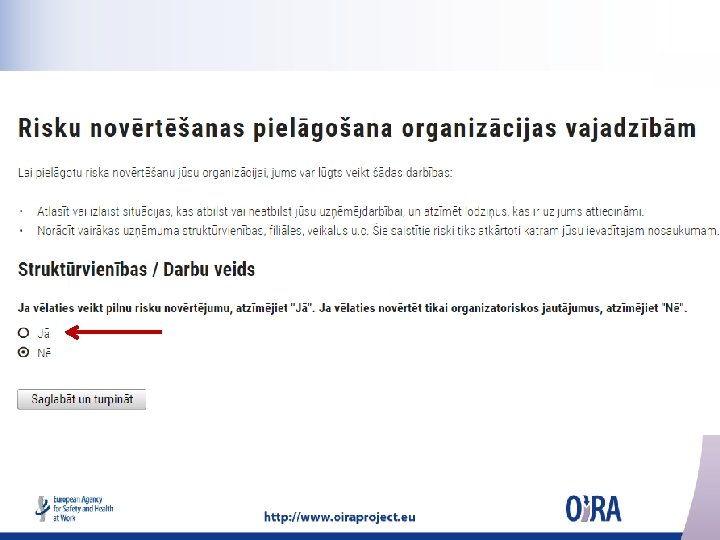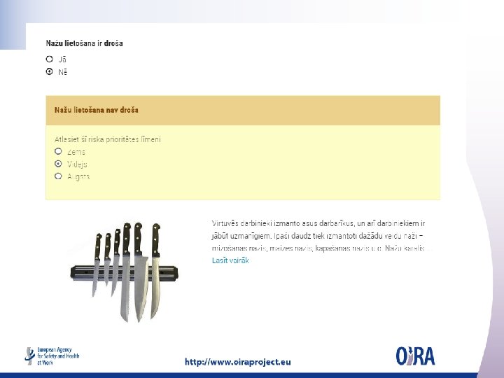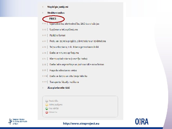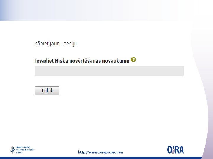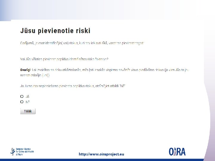 Kas ir Oi. RA? Online interactive Risk Assessment Riska interaktīvā novērtēšana tiešsaistē: 1. Risku identifikācija + Risku novērtēšana 2. Veicamo pasākumu noteikšana
