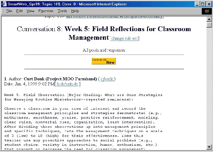 Bill Brescia’s (2000) Doc Research on Online Mentoring • Simple feedback vital, student clarification too • Want professor opinions & resource suggestions • Modeling useful at start; summing at end of semester • Most students saw value of reflection, not all • Student resistance to reading long posts • Students resistant to weekend posting; continued posts • Changing subject link impt to facilitating discussion
