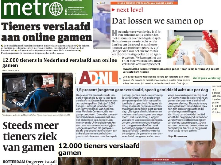 Voorwaarts… 1. Training Preventie van internet- en gameverslaving Tony van Rooij, Elske Wits (IVO), Agnes van der Poel (Trimbos Instituut), Bianca Swart (Tactus Verslavingszorg), Bart Alders (Mondriaan zorggroep) Regina van den Eijnden (Universiteit Utrecht) 2. Website Gameadvies op maat. nl Tony van Rooij, Tim Schoenmakers, Dike van de Mheen (IVO) Wim Buisman (Resultaten Scoren)