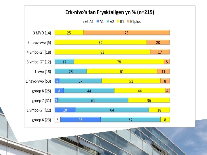 Wat binne de doelgroepen (en it ferwachte rr. F-einnivo=80%)? • • • Basisûnderwiis groep 5 o/m 8 (A 2) Basisfoarming havo-vwo 3 de klasse B 1(+) Boppebou Vmbo TG (B 1) Boppebou havo en vwo (resp. B 2 en C 1) HBO (B 2+) Universiteit (C 1+)
