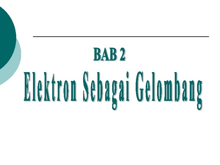 Elektron Sebagai Gelombang Elektron Sebagai Partikel dan Elektron Sebagai Gelombang Elektron dapat dipandang sebagai gelombang tidaklah berarti bahwa elektron adalah gelombang; akan tetapi kita dapat mempelajari gerakan elektron dengan menggunakan persamaan diferensial yang sama bentuknya dengan persamaan diferensial untuk gelombang. Elektron sebagai partikel: massa tertentu, m. Elektron sebagai gelombang massa nol, tetapi = h/mve. Elektron sebagai partikel: Etotal = Ep+ Ek= Ep+ mve 2/2. Elektron sebagai gelombang: Etotal = hf = ħ. Elektron sebagai partikel: p = mve 2 Elektron sebagai gelombang: p = ħk = h/. Dalam memandang elektron sebagai gelombang, kita tidak dapat menentukan momentum dan posisi elektron secara simultan dengan masing-masing mempunyai tingkat ketelitian yang kita inginkan secara bebas. Kita dibatasi oleh prinsip ketidakpastian Heisenberg: p x h. Demikian pula halnya dengan energi dan waktu: E t h.