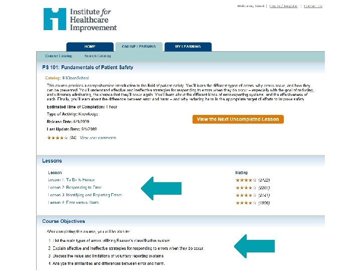 IHI Open School Courses Improvement Capability QI 101: Fundamentals of Improvement QI 102: The Model for Improvement: Your Engine for Change QI 103: Measuring for Improvement QI 104: Putting It All Together: How Quality Improvement Works in Real Health Care Settings QI 105: The Human Side of Quality Improvement QI 106: Level 100 Tools Person- and Family-Centered Care PFC 101: Dignity and Respect Quality, Cost, and Value QCV 101: Achieving Breakthrough Quality, Access, and Affordability Triple Aim for Populations TA 101: Introduction to Population Health Patient Safety PS 100: Introduction to Patient Safety PS 101: Fundamentals of Patient Safety PS 102: Human Factors and Safety PS 103: Teamwork and Communication PS 104: Root Cause and Systems Analysis PS 105: Communicating with Patients after Adverse Events PS 106: Introduction to the Culture of Safety PS 201: Partnering to Heal: Teaming Up Against Healthcare-Associated Infections PS 202: Preventing Pressure Ulcers Leadership L 101: Becoming a Leader in Health Care