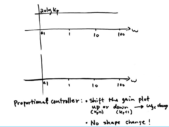 Proportional controller design • Obtain open loop Bode plot • Convert design specs into Bode plot req. • Select KP based on requirements: – For improving ess: KP = Kp, v, a, des / Kp, v, a, act – For fixing Mp: select wgcd to be the freq at which PM is sufficient, and KP = 1/|G(jwgcd)| – For fixing speed: from td, tr, tp, or ts requirement, find out wn, let wgcd = wn and choose KP as above