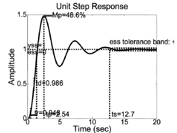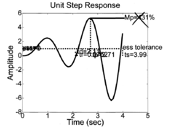 clear all; n=[0 0 40]; d=[1 2 0]; figure(1); clf; margin(n, d); %proportional control design: figure(1); hold on; grid; V=axis; Mp = 10; %overshoot in percentage PMd = 70 -Mp + 3; semilogx(V(1: 2), [PMd-180], ': r'); %get desired w_gc x=ginput(1); w_gcd = x(1); KP = 1/abs(evalfr(tf(n, d), j*w_gcd)); figure(2); margin(KP*n, d); figure(3); mystep(KP*n, d+KP*n);