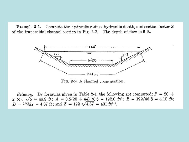 Fr – Subcritical or Supercritical • Open-Channel Flow: – Subcritical (fluvial) Flow – Fr < 1 (Disturbance waves can not be transferred upstream against flow) – Critical Flow – Fr = 1 – Supercritical (Torrential) Flow – Fr > 1