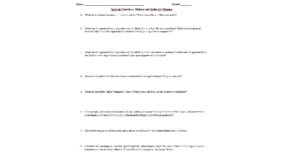 Homework Due 6/12 Lab #21 Malaria and Sickle Cell Disease Analysis Questions. Use data from previous slide to reference for your answers.