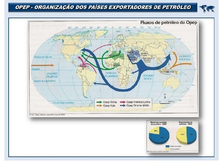 Porque da criação da OPEP? E a influência no mundo. Procura controlar a produção e os preços do petróleo em escala global, um exemplo verdadeiro de cartel do petróleo. As nações que formam a OPEP, embora possuam grandes reservas de petróleo, integram o grupo dos países subdesenvolvidos, com elevados índices de pobreza. O controle dos preços pela OPEP fez com que países que não fazem parte dele, como o Brasil, a explorar suas reservas, pois a importação deixou de ser a melhor alternativa. País Líder da OPEP: Arábia Saudita