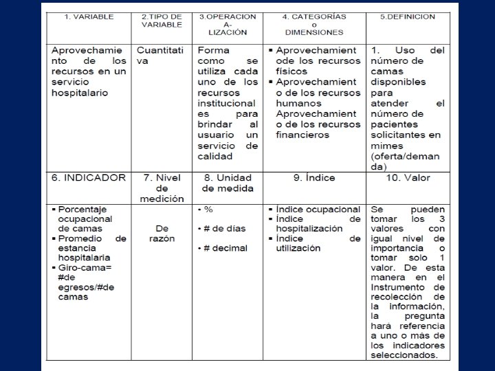 Categorización o Dimensión • Cuando el concepto tiene varias dimensiones o clasificaciones o categorías, éstas deben especificarse en el estudio; tal es el caso de la variable “recursos» , que puede hacer referencia a “recursos técnicos, financieros, ambientales, humanos entre otros» .