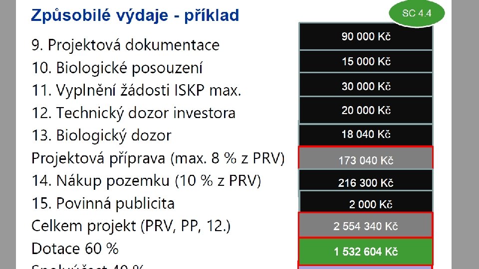 Kumulativní rozpočet Souhrn všech výdajů na projetk: Realizace Přímé: základní realizační náklady včetně osobních pokud jsou vyžadovány Nepřímé: nákup nemovitosti, vynětí ze ZPF/PUPFL Projektová příprava, dozor Projekt, Biologické posouzení aj. , technický a autorský dozor, zpracování žádosti v ISKP 2014+, manažerské řízení, výběrové řízení Nepřímé režijní a provozní náklady Povinná publicita a propagace