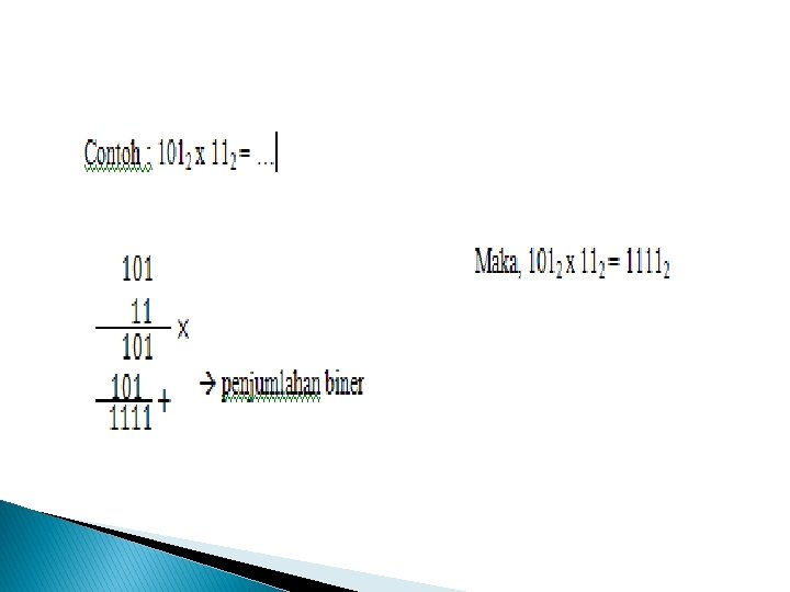 Perkalian Biner Dilakukan sama dengan cara perkalian pada bilangan desimal. Dasar perkalian bilangan biner adalah : 0 x 0=0 1 x 0=0 0 x 1=0 1 x 1=1