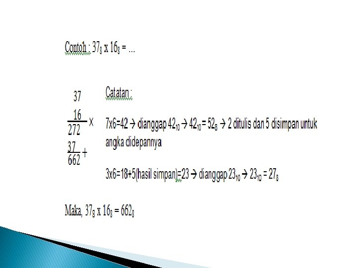 Perkalian Oktal � Langkah-langkah operasi perkalian pada bilangan oktal atau bilangan berbasis 8 adalah sebagai berikut : kalikan masing-masing kolom secara desimal rubah dari hasil desimal ke octal tuliskan hasil dari digit paling kanan dari hasil octal kalau hasil perkalian tiap kolom terdiri dari 2 digit, maka digit paling kiri merupakan carry of untuk ditambahkan pada hasil perkalian kolom selanjutnya. ◦ Pada perkalian oktal juga terdapat penjumlahan oktal didalamnya. ◦ ◦