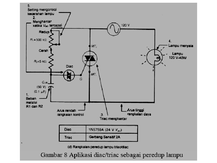 Rangkaian eksperimental peredup lampu triac/diac diperlihatkan pada Gambar 8. Ketika tahanan variabel R, ada pada harga terendahnya (terang), kapasitor C 1 mengisi dengan cepat pada permulaan dari masing setengah siklus dari tegangan ac. Jika tegangan antara C 1, mencapai tegangan triac over dari diac, C 1 dikosongkan pada gerbang triac. Jadi, triac ON (lebih awal) pada tiap setengah siklus dan bertahan hidup (ON) sampai akhir triac setengah siklus. Oleh karena itu. arus akan mengalir lewat lampu untuk sebagian besar dari diac setengah siklus dan menghasilkan kecerahan (terang) yang penuh. Pada saat tahanan R 1 naik, waktu yang diperlukan untuk mengisi C 1, sampai tegangan breakover dari diac bertambah. Hal ini menyebabkan triac menyala kemudian pada setiap setengah siklus. Sehingga panjang waktu arus mengalir pada lampu menjadi berkurang dan cahaya yang dipancarkan juga berkurang.