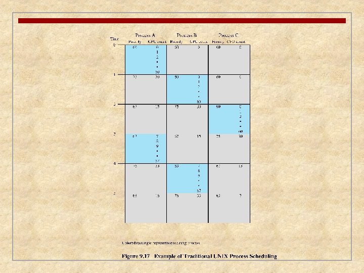 Traditional UNIX Scheduling n Used in both SVR 3 and 4. 3 BSD UNIX n these systems are primarily targeted at the time-sharing interactive environment n Designed to provide good response time for interactive users while ensuring that low-priority background jobs do not starve n Employs multilevel feedback using round robin within each of the priority queues n Makes use of one-second preemption n Priority is based on process type and execution history