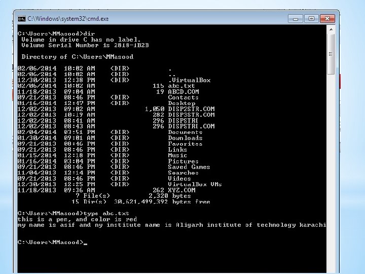 VER : This command is use to display version of operating system. Syntax VER Example C: > VER DIR : This command is use to Display files and folder/ sub directory Syntax DIR /a/p/w [drive: pathnamefilename] Example C: > DIR/P C: > DIR/W/P d: d: *. txt