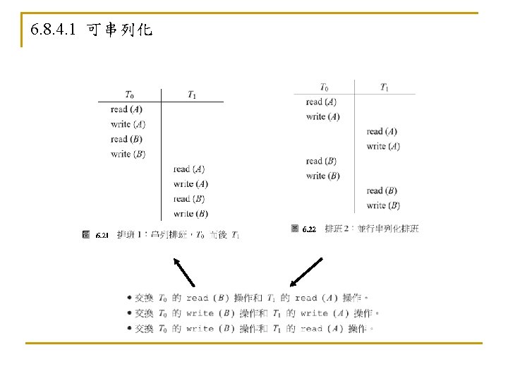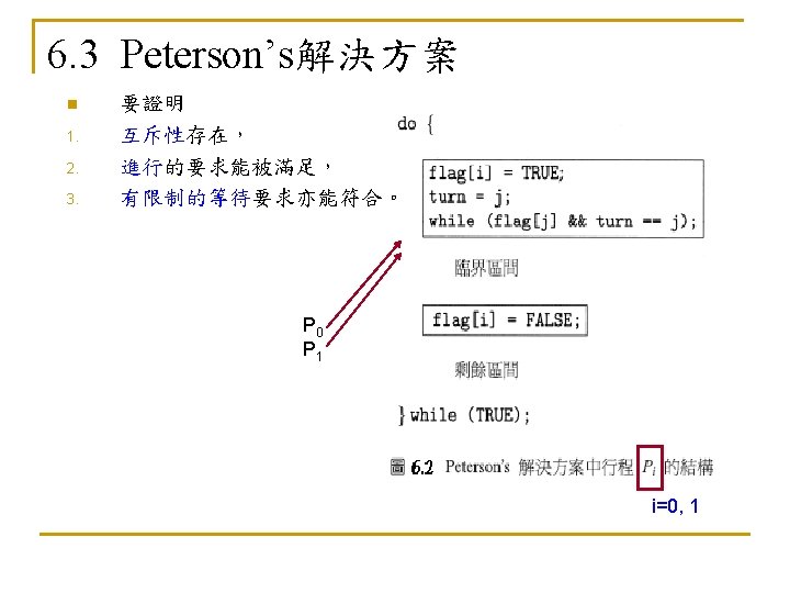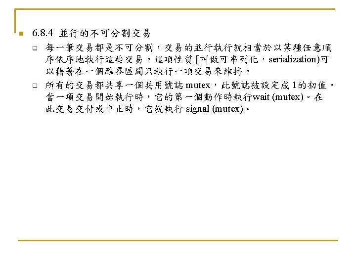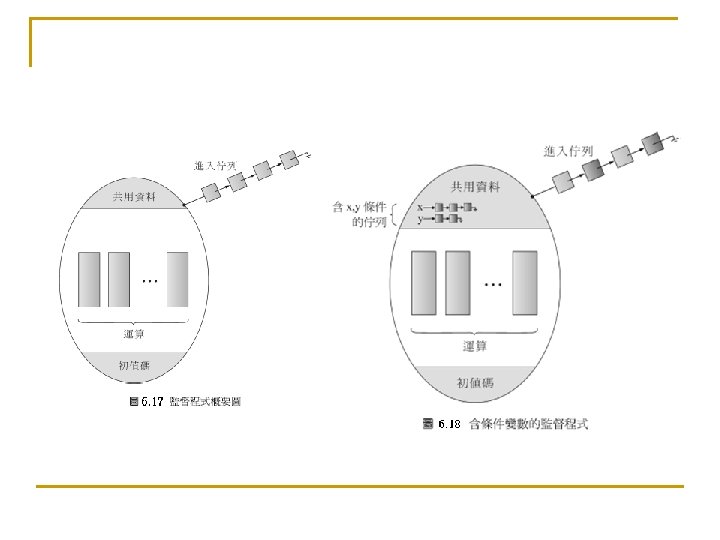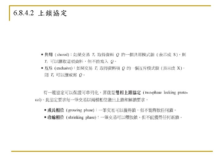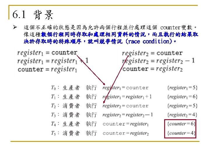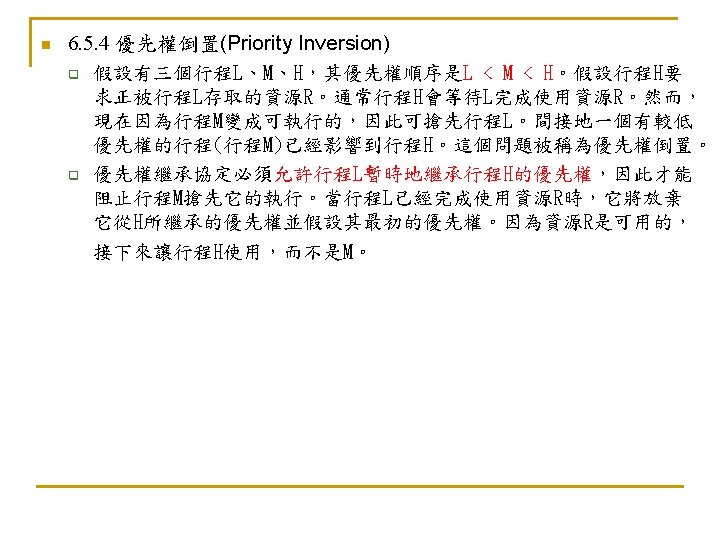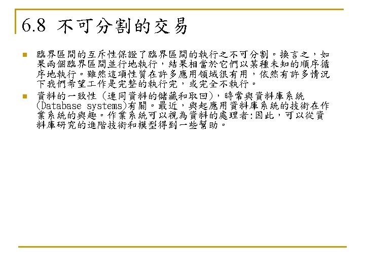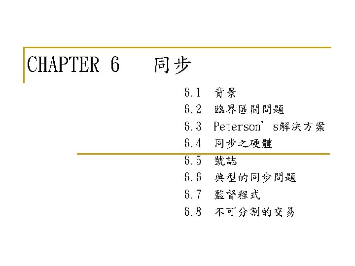 6. 5. 3 死結和飢餓(Deadlock and Starvation) n n Deadlock – two or more processes are waiting indefinitely for an event that can be caused by only one of the waiting processes Let S and Q be two semaphores initialized to 1 P 0 P 1 wait (S); wait (Q); . . . signal (S); signal (Q); n n wait (Q); wait (S); . . . signal (Q); signal (S); Starvation – indefinite blocking. A process may never be removed from the semaphore queue in which it is suspended Priority Inversion - Scheduling problem when lower-priority process holds a lock needed by higher-priority process