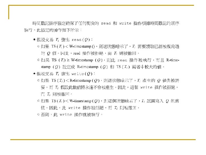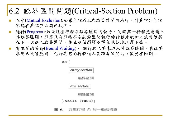 6. 6 典型的同步問題 n 6. 6. 1 有限緩衝區問題(Bounded-Buffer Problem) n n N buffers, each can hold one item Semaphore mutex initialized to the value 1 Semaphore full initialized to the value 0 Semaphore empty initialized to the value N.