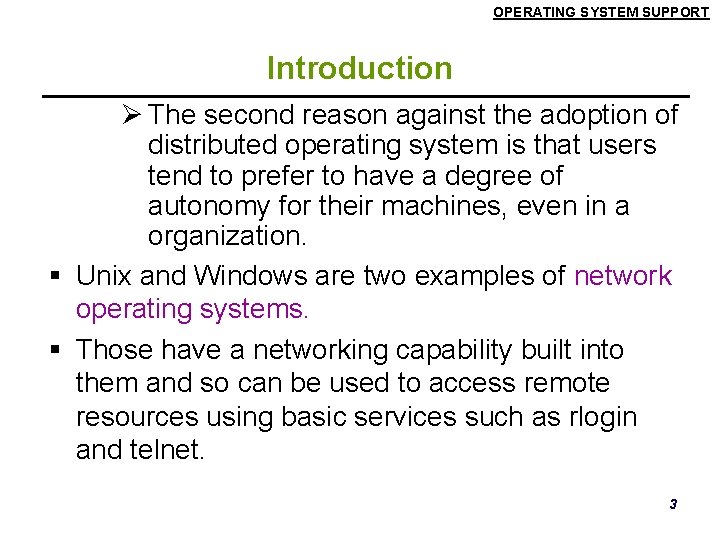 OPERATING SYSTEM SUPPORT Introduction § Many distributed operating systems have been investigated, but there are none in general/wide use. § But network operating system are in wide use for various reasons both technical and non-technical. Ø Users have much invested in their application software; they will not adopt a new operating system that will not run their applications. 2