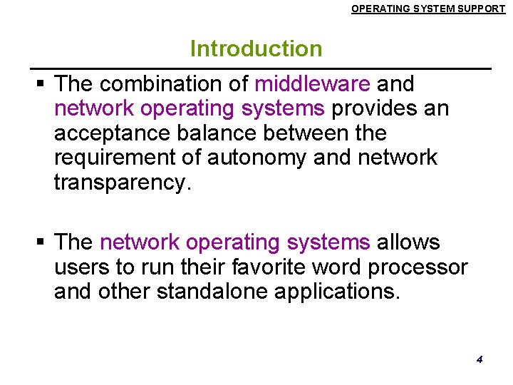 OPERATING SYSTEM SUPPORT Introduction Ø The second reason against the adoption of distributed operating system is that users tend to prefer to have a degree of autonomy for their machines, even in a organization. § Unix and Windows are two examples of network operating systems. § Those have a networking capability built into them and so can be used to access remote resources using basic services such as rlogin and telnet. 3