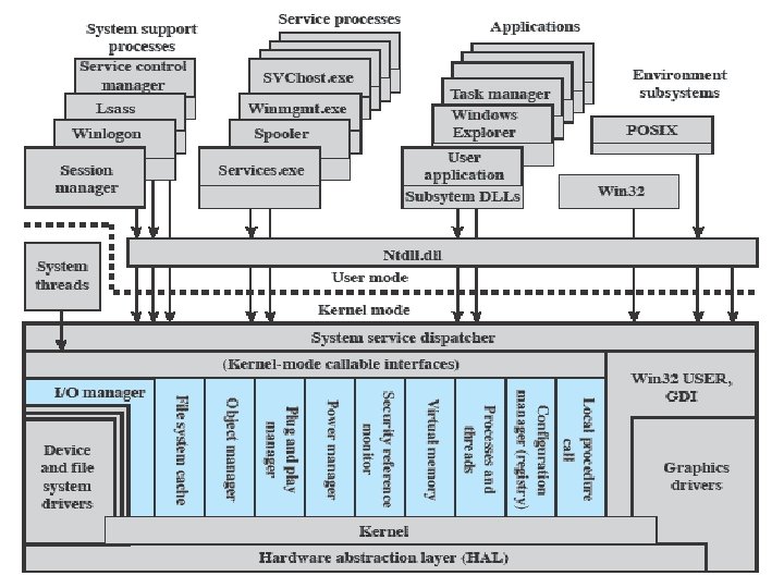 Kernel-Mode Components (1) • Kernel – Consists of the most used low level components: scheduling, process switching, interrupt handling • Hardware abstraction layer (HAL) – Isolates the operating system from platformspecific hardware differences – portability – DMA, bus, interrupts, timer