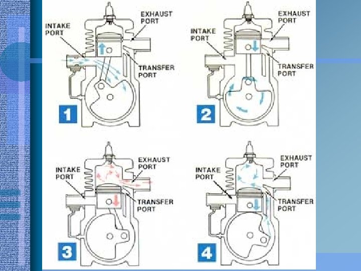 Two-Stroke Cycle • In a two-stroke cycle, the four events are: intake, compression, power, and exhaust. • All must occur, but more than one event takes place during each stroke. • The four events (one cycle) are completed in two strokes making one revolution of 360° degrees, which accounts for the name. TWO-STROKE CYCLE ENGINE