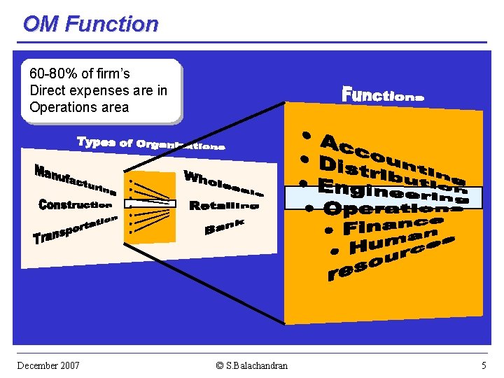 Current Relevance • Success/failure & growth depend on Operational Excellence • Types of Organisations ? – Business, Govt. , NPO, NGO – Products & Services • Career Opportunities • Tools & Techniques for study & solution of – Operations Problems – Problems in other Functions • Window to Organisational Processes December 2007 © S. Balachandran 4