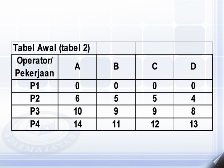 Langkah-langkah Metode Hungarian 1. Mengubah Matriks biaya menjadi matriks opportunity cost: Caranya: pilih elemen terkecil dari setiap baris, kurangkan pada seluruh elemen baris tersebut Reduced cost matrix Pekerjaan Karyawan I II IV A Rp 0 15 Rp 5 20 3 18 Rp 7 22 Rp B 0 14 2 16 3 17 C 5 25 1 17 0 20 2 18 7 21 3 23 D 2 18 0 20 0 16
