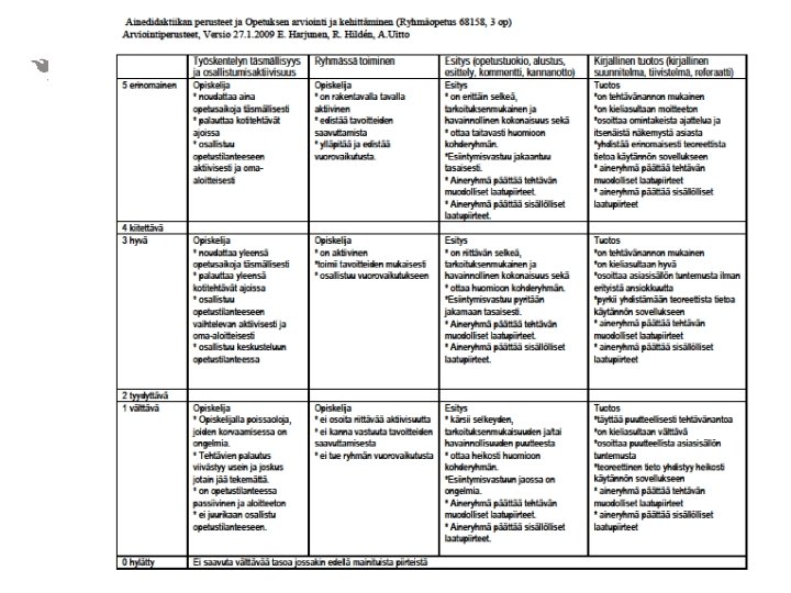 Kurssin arviointi n Arvioinnissa sovelletaan kurssilla käsiteltyjä arviointikriteerejä, kuten Bloomin taksonomiaa ja SOLOmallia. n Ryhmäopetusarvioinnissa käytetään seuraavalla dialla esitettyä taulukkoa.