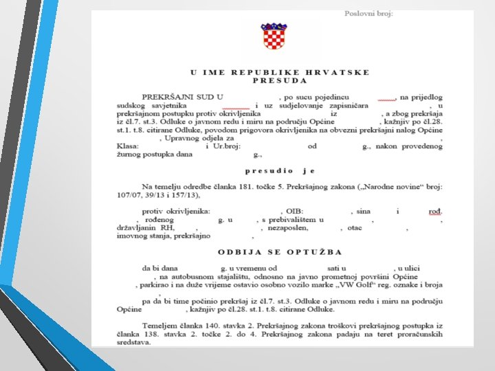 KAZNENE ODREDBE Prekršajni zakon (Narodne novine 107/07, 39/13, 157/13, 110/15, 70/17 i 118/18) Članak 2. PZ-a (Načelo zakonitosti) Prekršaji i prekršajnopravne sankcije mogu se propisivati zakonom i odlukama jedinica lokalne i područne (regionalne) samouprave. Jedinice lokalne i područne (regionalne) samouprave mogu propisivati prekršaje i prekršajnopravne sankcije samo za povrede propisa koje ona donose na temelju svoje nadležnosti utvrđene Ustavom i zakonom i tu ovlast ne mogu prenijeti na drugoga. Nitko ne može biti kažnjen niti se prema njemu može primijeniti druga prekršajnopravna sankcija za djelo koje prije nego je bilo počinjeno nije bilo zakonom ili međunarodnim pravom ili odlukom jedinice lokalne i područne (regionalne) samouprave određeno kao prekršaj i za koji zakonom ili odlukom jedinice lokalne i područne (regionalne) samouprave nije bilo propisano koja se vrsta i mjera prekršajnopravne sankcije počinitelju može izreći, odnosno primijeniti. Članak 6. PZ-a Opća svrha propisivanja i izricanja ili primjene svih prekršajnopravnih sankcija je da svi građani poštuju pravni sustav i da nitko ne počini prekršaj, te da se počinitelji prekršaja ubuduće tako ponašaju. (specijalna i generalna prevencija)