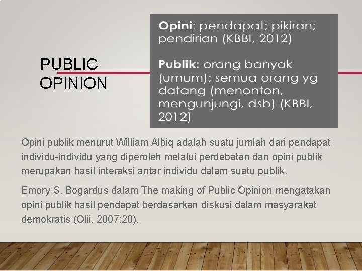 PUBLIC OPINION Opini publik menurut William Albiq adalah suatu jumlah dari pendapat individu-individu yang diperoleh melalui perdebatan dan opini publik merupakan hasil interaksi antar individu dalam suatu publik. Emory S. Bogardus dalam The making of Public Opinion mengatakan opini publik hasil pendapat berdasarkan diskusi dalam masyarakat demokratis (Olii, 2007: 20).