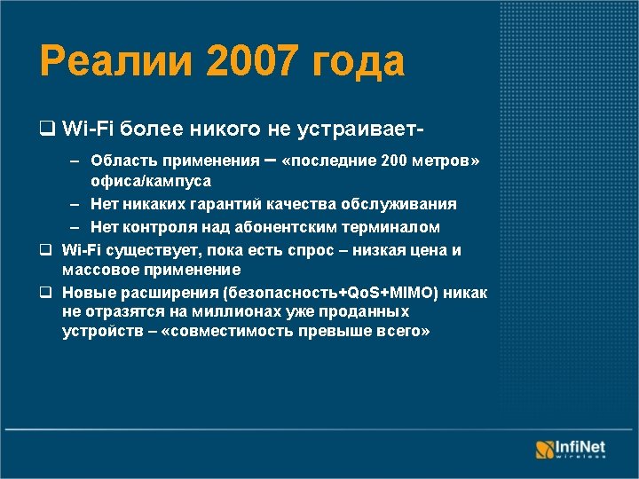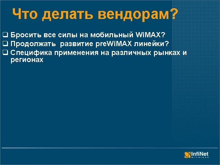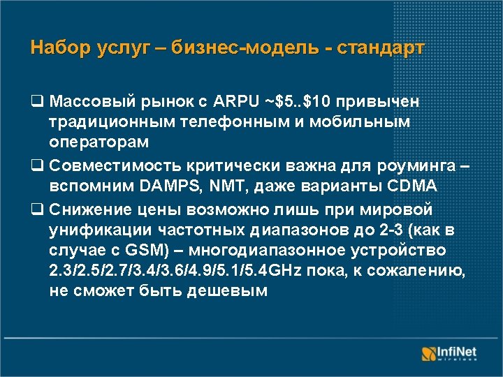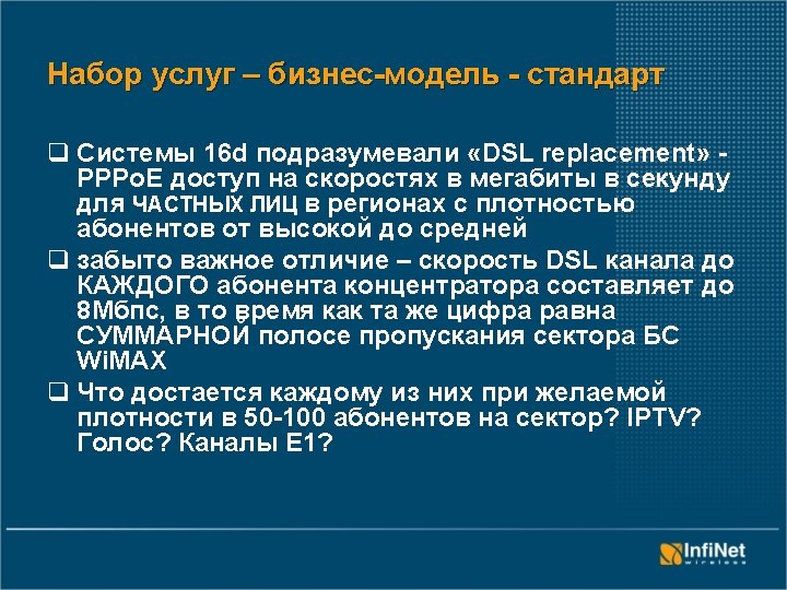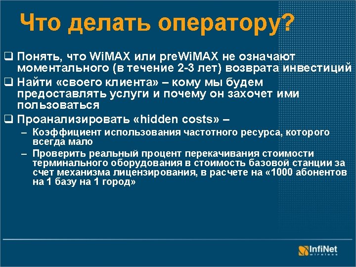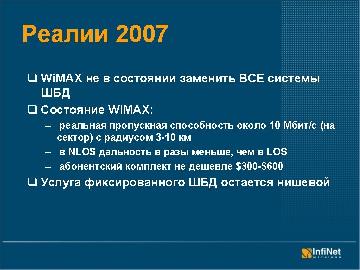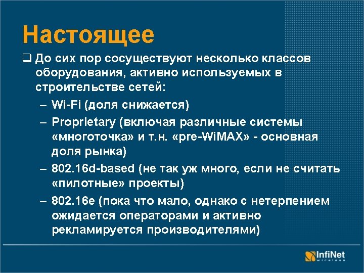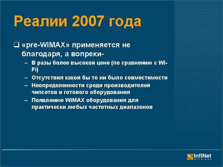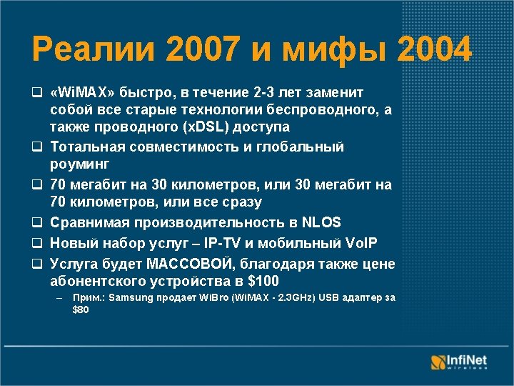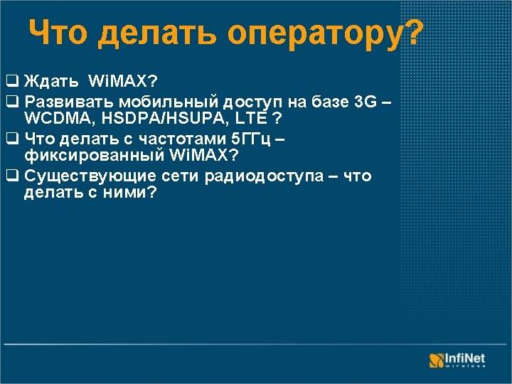 Restraining factors q Wireless Access needs spectrum, which is not uniformly allocated all over the world – Wi. MAX Forum (and vendors) have been focused on 3. 5 GHz band for fixed and 2. 5 GHz mobile Wi. MAX profiles – Very often 3. 5 GHz is densely occupied by incumbent carriers, VSAT links, etc. – Cost of 2. 3 -2. 7 GHz spectrum is too high – most mobile carriers already there q Performance is usually far less than in adverts q “Cost per new subscriber” restricts massive rollout of “public” access services 17