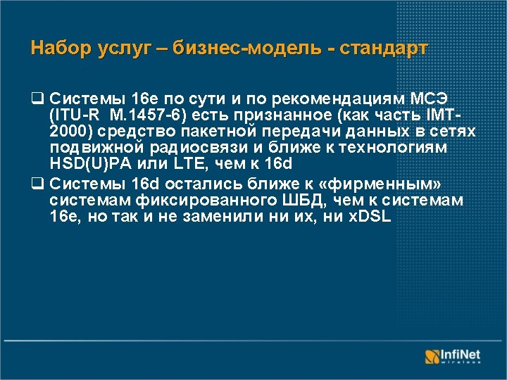 Wi. MAX technology restrictions q Typical (best case) RTT (station-to-server) is ~80 ms, worst case delay is >100 ms in a normal operating conditions – still better than in “traditional” GSM/CDMA mobile networks – Too big for Vo. IP within site-to-site VPN even if both users are in the same network – Fractional E 1 (or other TDM) services over Wi. MAX will require extra dejitter buffer/echo cancellation circuits (typ. jitter is >20 ms) 23