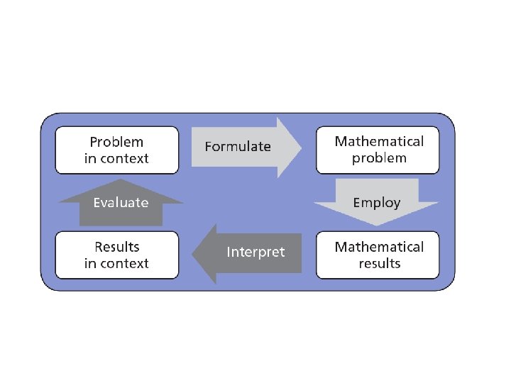 Formulate, Employ, Interpret and Evaluate • Formulating situations mathematically involves identifying how to apply and use mathematics to the problem being posed in the real world—it includes being able to take a situation and transform it into a form amenable to mathematical treatment; • Employing mathematical concepts, facts, procedures, and reasoning involves using mathematical concepts, procedures, facts and tools to derive a mathematical solution; • Interpreting and evaluating the mathematical outcomes involves reflecting upon mathematical solutions or results and interpreting or evaluating them back in the context of the initial problem.