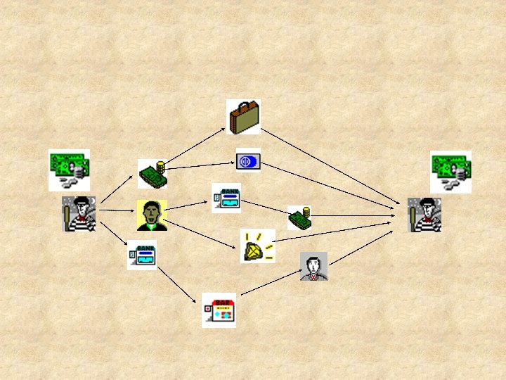 FAZE PRANJA DENARJA PLASIRANJE PRIKRIVANJE VIR PRIHODKA $ -davčna utaja -goljufija -poneverba -mamila -tatvina -korupcija CILJ Plasiranje PPK v finančni sistem -depoziti GT -prenosi GT -konverzije -menjava v bankovce večjih vrednosti CILJ Prikrivanje kriminalnega izvora PPK -elektronski prenosi -geografska razpršenost -uporaba GT -uporaba več računov -off shore INTEGRACIJA Legalizacija CILJ Ustvarjanje videza legalnosti INTEGRACIJA Investiranje CILJ Uporaba PPK -fiktivna posojila, -poraba pogodbe -prenosi lastništva -transakcije s tretjimi osebami -investiranje v gospodarstvo -ponovno investiranje v kriminal