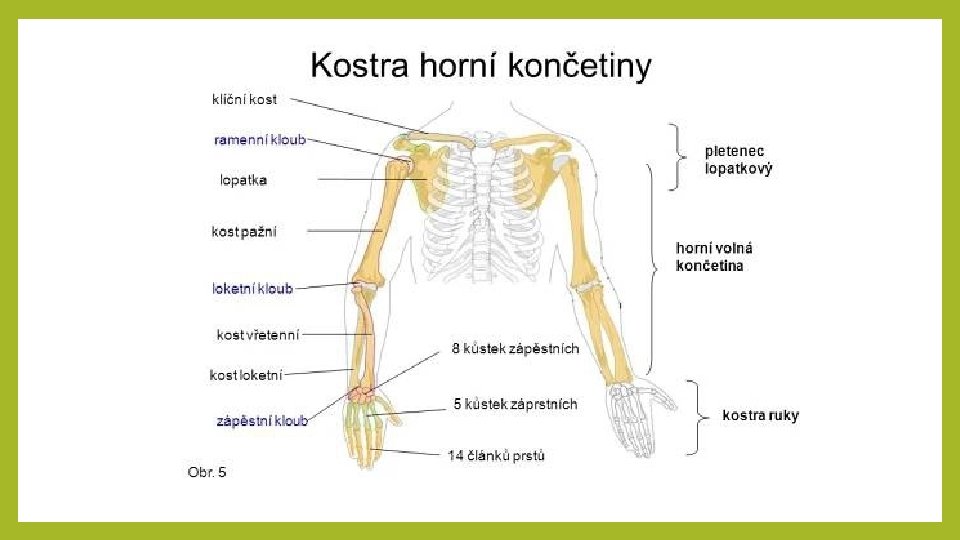 Kostra horní končetiny Ø Pletenec horní končetiny – lopatka a klíční kost Ø kloub ramenní Ø kost pažní Ø kloub loketní Ø předloktí – kost vřetenní – směřuje k palci. kost loketní – směřuje k malíku Ø kostra ruky – zápěstní kůstky (8) - záprstní kůstky (5) - články prstů (14)