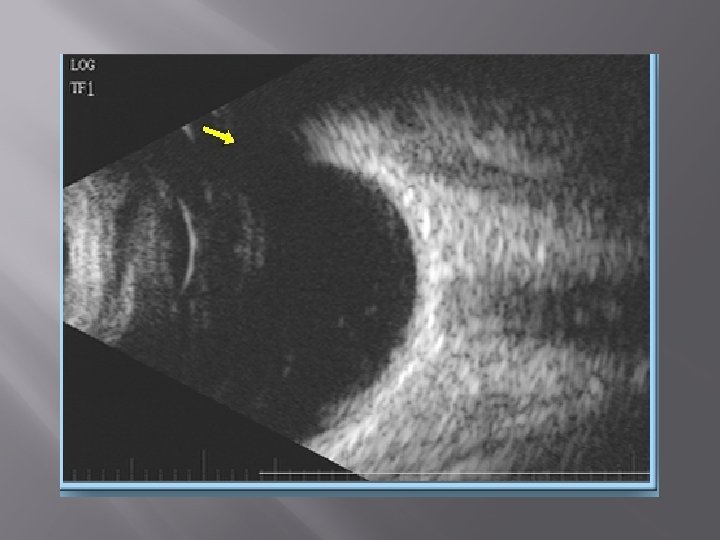 A- SCAN OF ANTERIOR SEGMENT • A- scan is only useful in the evaluation of ant chamber foreign body and ant chamber tumours. • It shows 3 spikes- first produced by cornea, second by iris and third by posterior capsule of lens.