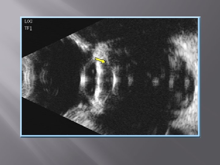 NORMAL ANATOMY ON B-SCAN � � � � Normal anatomy is obtained by placing the probe on cornea such that the marker faces temporally. First structure to be visualised is the posterior capsule which is seen as a curvilinear echogenic structure. Vitreous cavity is circular in shape and is anechoic. Optic disc is small area at the anterior end of optic nerve. Macular region is temporal to the optic disc. Optic nerve is seen as an anechoic linear shadow in the retro-ocular space. Orbital fat is seen as a triangular echogenic structure. Extra ocular muscles are seen as linear hypo echoic structures at the periphery of the orbital fat.