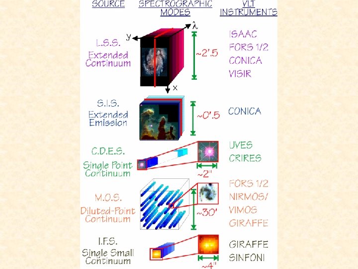 FORS: Grism mode • Grisms from 150 gr/mm to 1400 gr/mm • Spectroscopic modes – ‘slitless’ MOS mode (R is given by seeing) – Mask with up to 9 ‘long slits’ of 0. 3” x 6. 8’ – Up to 19 movable ‘slitlets’ of 0. 3” x 22. 5” – MOS-MXU: Laser-cut masks (any format) • Spectral resolution depends on grism dispersion and slit width in dispersion direction.