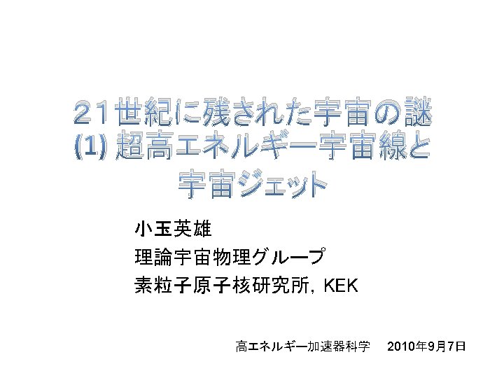 GZK効果 Lorentz不変性の破れ? GZK limit = 5£ 1010 Ge. V p + CMB ! N + GZK限界を超える宇宙線 陽子は 100 Mpc以上の距 離を飛べない. GZK=Greisen-Zatsepin. Kuzmin(1966) From http: //pdg. lbl. gov/