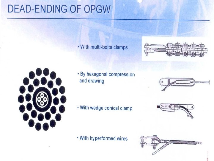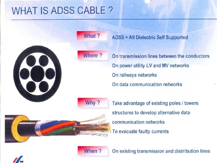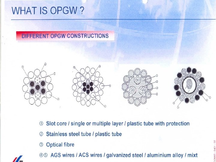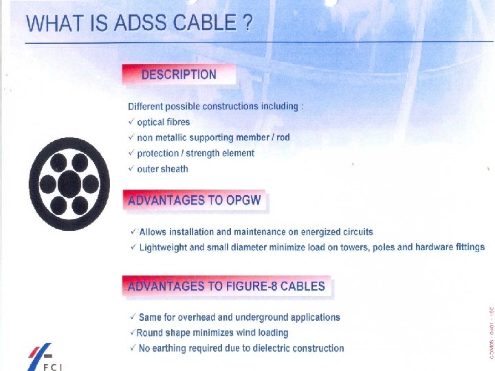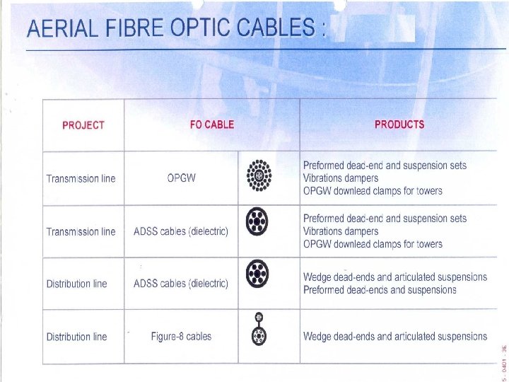 VARIOUS TYPES OF OPTICAL FIBER CABLES 1. OPGW Cable 2. ADSS type OF Cable 3. Self-Support AERIAL figure 8 type OF Cable 4. LASHED type OF Cable 5. UNDERGROUND / BURRIED type OF Cables 6. DUCT Type OF Cable
